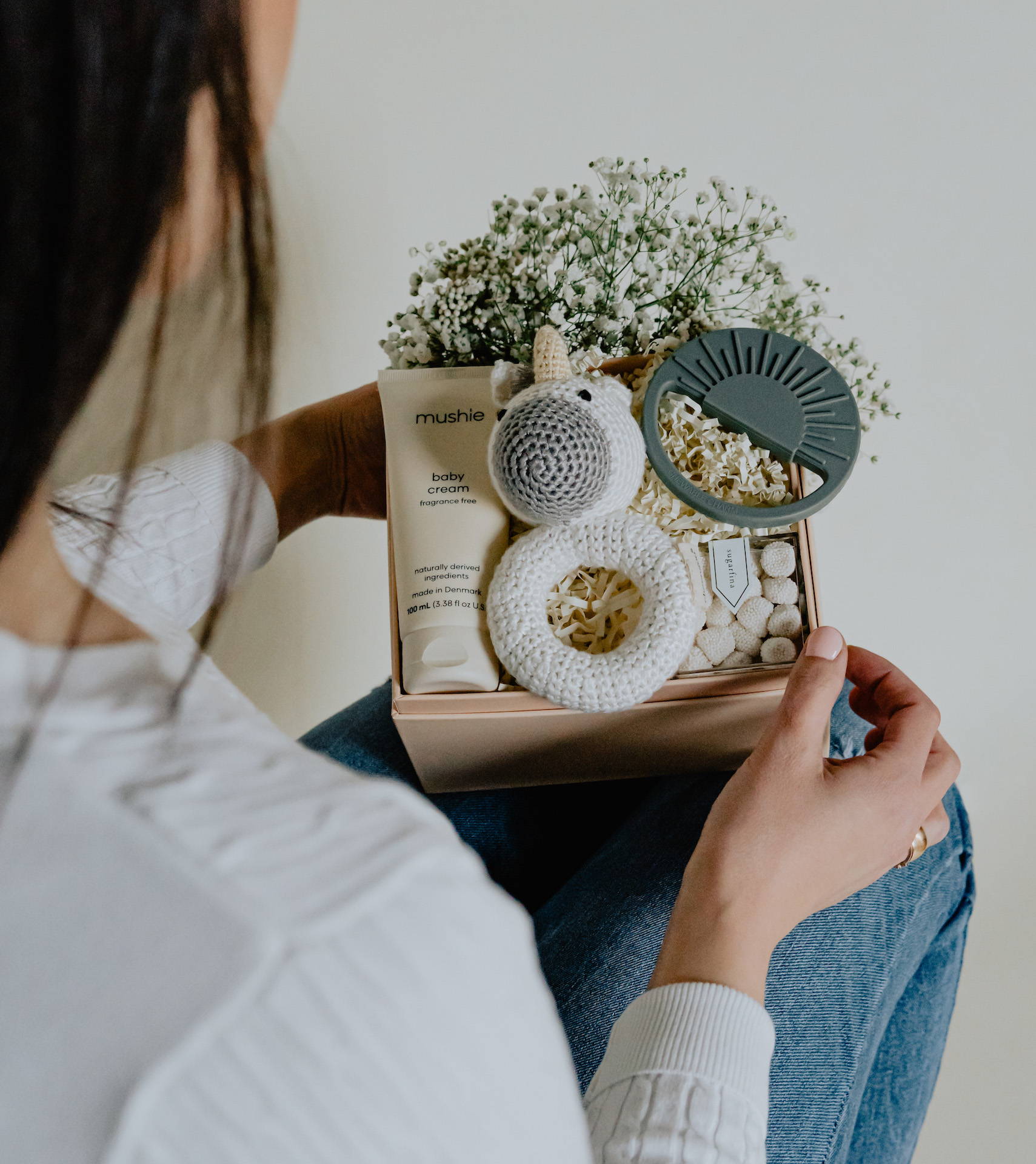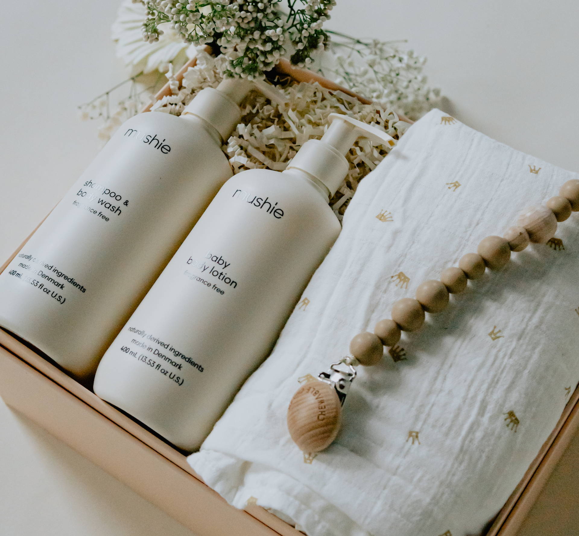 Surprise the newest member of the family with the DEAR BEBE GIFT BOX! This gift box is perfect for any newborn, as it comes with all the goodies you need to celebrate a baby's arrival! From the Mushie Baby Shampoo and Body Lotion, Wooden Pacifier Clip and more, they’ll have all the baby essentials they’ll need for the baby on the way! Pamper their sweet baby today - you won't regret it!