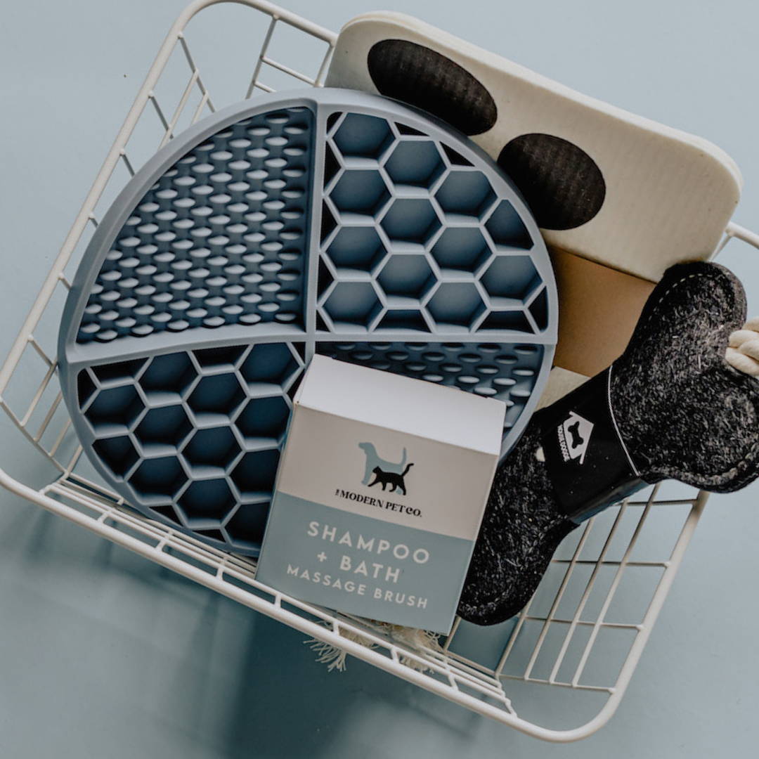 The next essential they’ll need is the Modern Pet Company's Super Suds Shampoo Brush. Because we’re always looking for ways to make bath time a bit more bearable, this shampoo dispenser brush is a mainstay in any tub. It’s perfectly palm sized with soft but sturdy silicone bristles that get the job done.